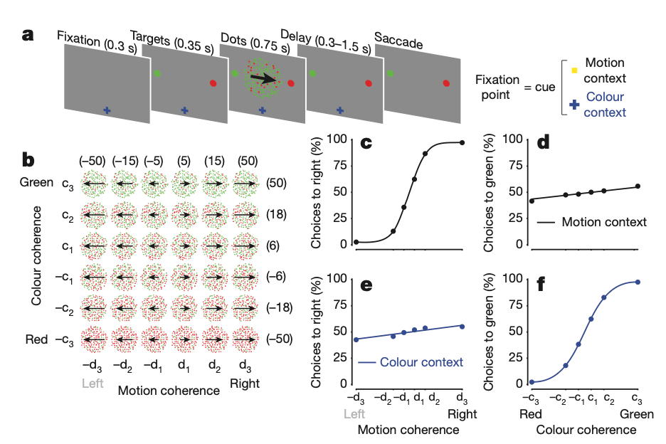 The task they were analyzing was slightly more complex than the classical random-dots discrimination task when animals (monkeys) had to decide whether noisy dots on a screen were moving more to the left or right by making an appropriate saccade (eye movement) in the corresponding direction; rather, animals were given a context signal that indicated whether to look for motion (left versus right), or color (red versus green) prompting them to accumulate information of the relevant stimulus.